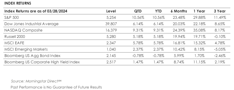 A holiday-shortened week concluded a marvelous month, quarter, and start to the year for markets. Unsurprisingly, U.S. stocks continue to lead the way. Per Morningstar Direct, the S&P 500 rallied 3.2% in March and 10.6% for the quarter—the best start since 2019—as positive momentum continued from last year's strong finish. March's gain makes it six straight months of market expansion.
