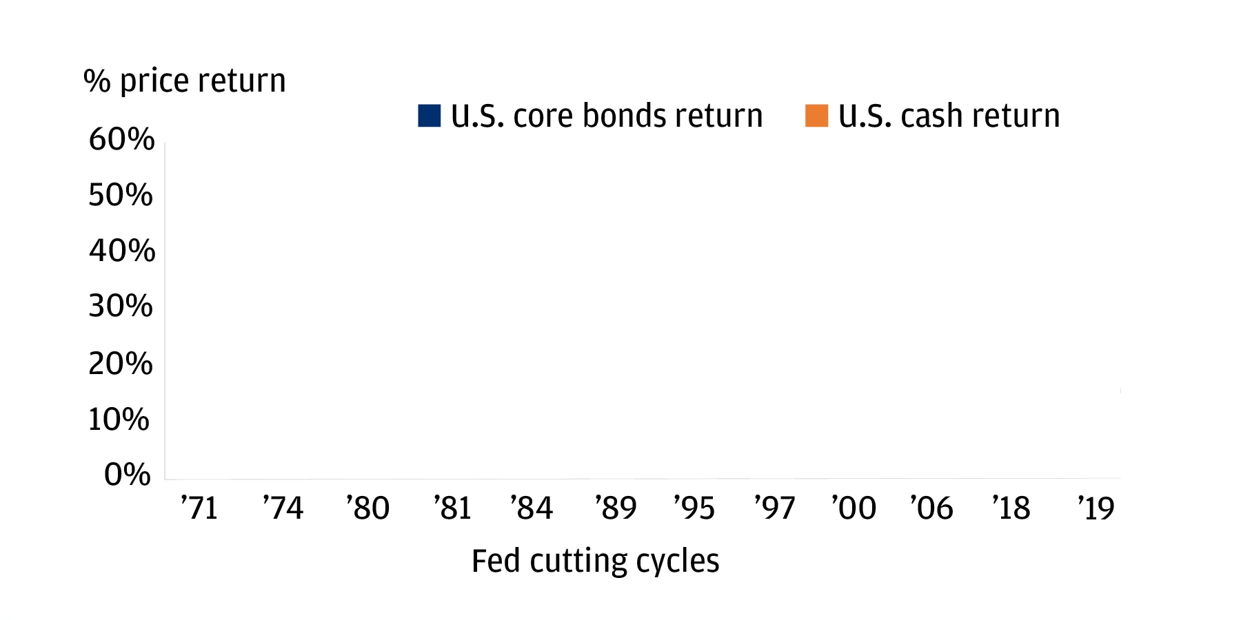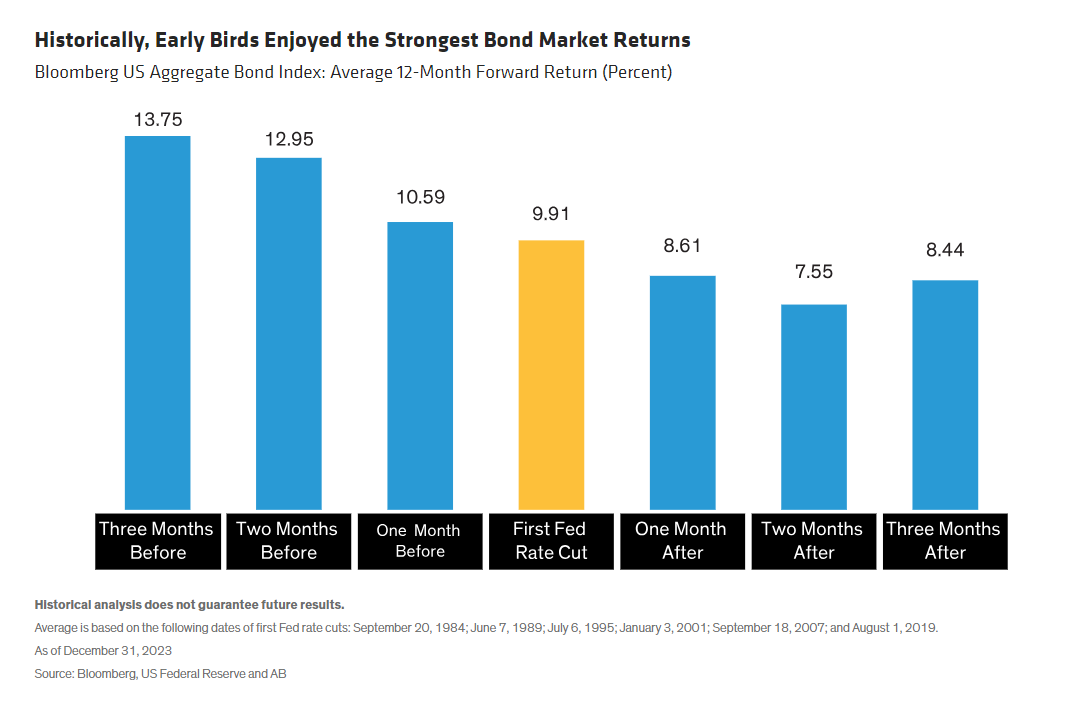 But when/if rates do eventually fall, bond investors need to be ready. History tells us that bonds thrive in this environment, particularly when compared to cash. Patient investors not only secure higher yields on bonds for years to come but also witness their bond holdings appreciate.