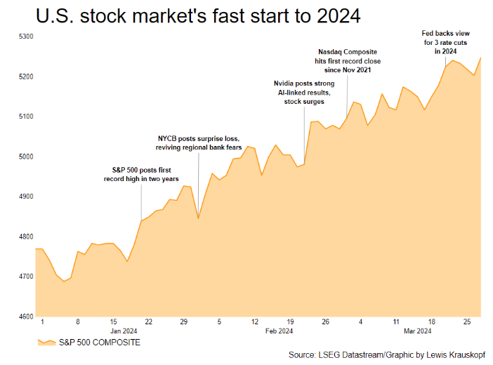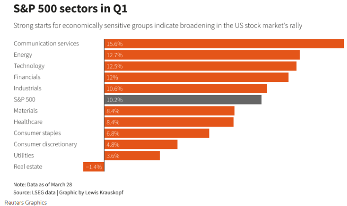 The S&P 500 surged 10.2%, its most impressive first-quarter leap since 2019, continuing its upward trajectory from the previous year.