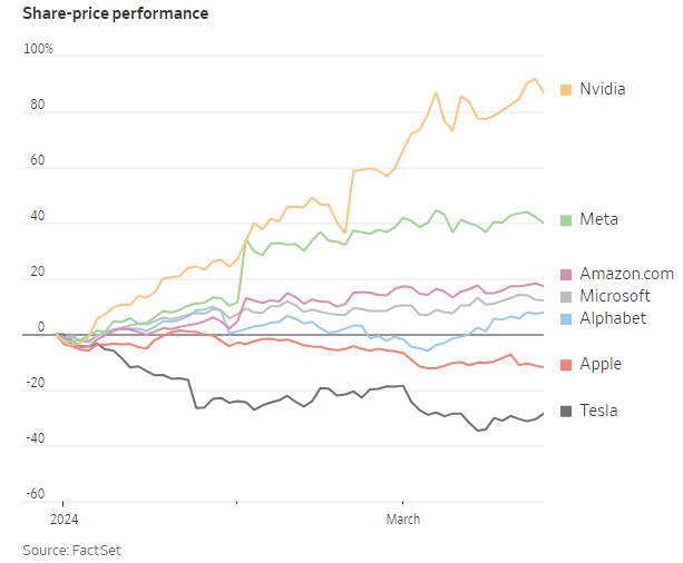 Last year, the Magnificent Seven -- those tech giants leading the AI revolution -- dominated the scene. This year? Not quite the same story is unfolding as a few members of this group are starting to fizzle. The other four – the final four – continue their amazing rally. These four stand outs are responsible for nearly half of the S&P 500’s first-quarter advance, according to Howard Silverblatt, senior index analyst at S&P Dow Jones Indices. Nvidia, as highlighted in last month's newsletter, remains a standout performer.