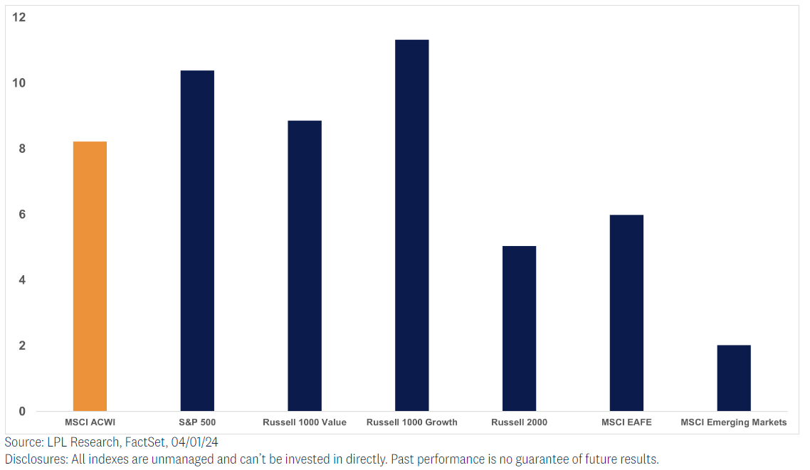 While the U.S. stock market often commands the spotlight, it's crucial to acknowledge the broader global landscape. The MSCI ACWI Index, our barometer for worldwide equities, notched an impressive 8.2% gain in Q1, buoyed by easing inflation worries. Central banks around the globe hinted at potential rate cuts, stirring hopes for a gentle economic descent, or what's often termed a "soft landing," invigorating investor spirits.