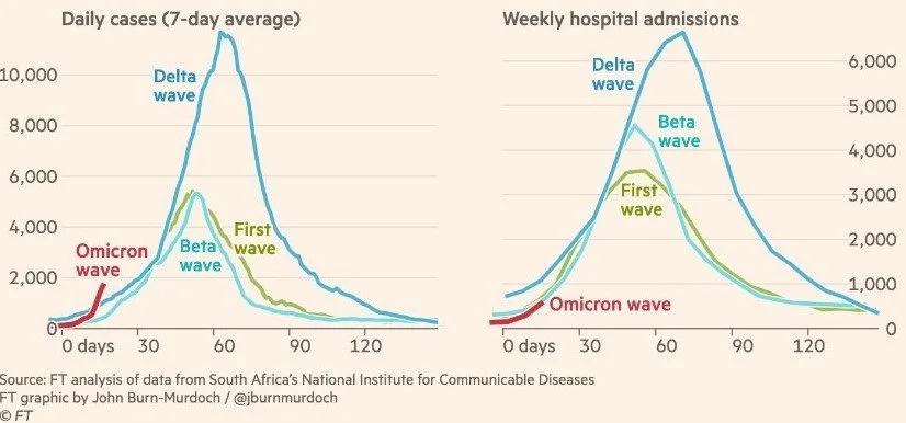 As the graph indicates, the Omicron variant is highly contagious but thus far is less severe than the other strains. This data should be interpreted with caution, of course, given its newness and small sample size. However, doctors who have been treating it in South Africa describe it as less virulent than Delta. According to experts, this is relatively consistent with the natural evolution of viruses – virulence tends to moderate as they mutate. This mutation causes the virus to become more easily infectious but simultaneously lose the ability to cause severe disease. Fingers crossed that this is what is happening with the Omicron variant. We will be paying close attention to data as it comes out.