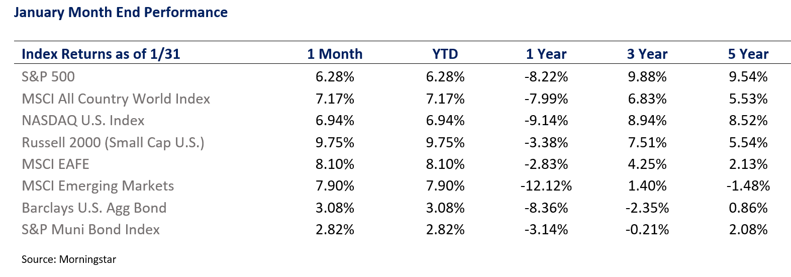 2023 has so far started exceedingly well for investors everywhere. Despite a rocky close to ’22, all major benchmarks finished January in the green with solid gains. Investors took solace in the near-term economic outlook looking less and less grim. Corporations, for example, have so far turned in a better-than-feared earnings season – not stellar, but not disastrous. In addition, inflation readings continue to show a downward trend (remember the second derivative?). Add it up, stocks were up, bonds were up, and even gold continued its shine (up 5% for the month). Even boring municipal bonds have had the best start in over a decade. After an agonizing ’22, January’s returns have been a welcome relief.