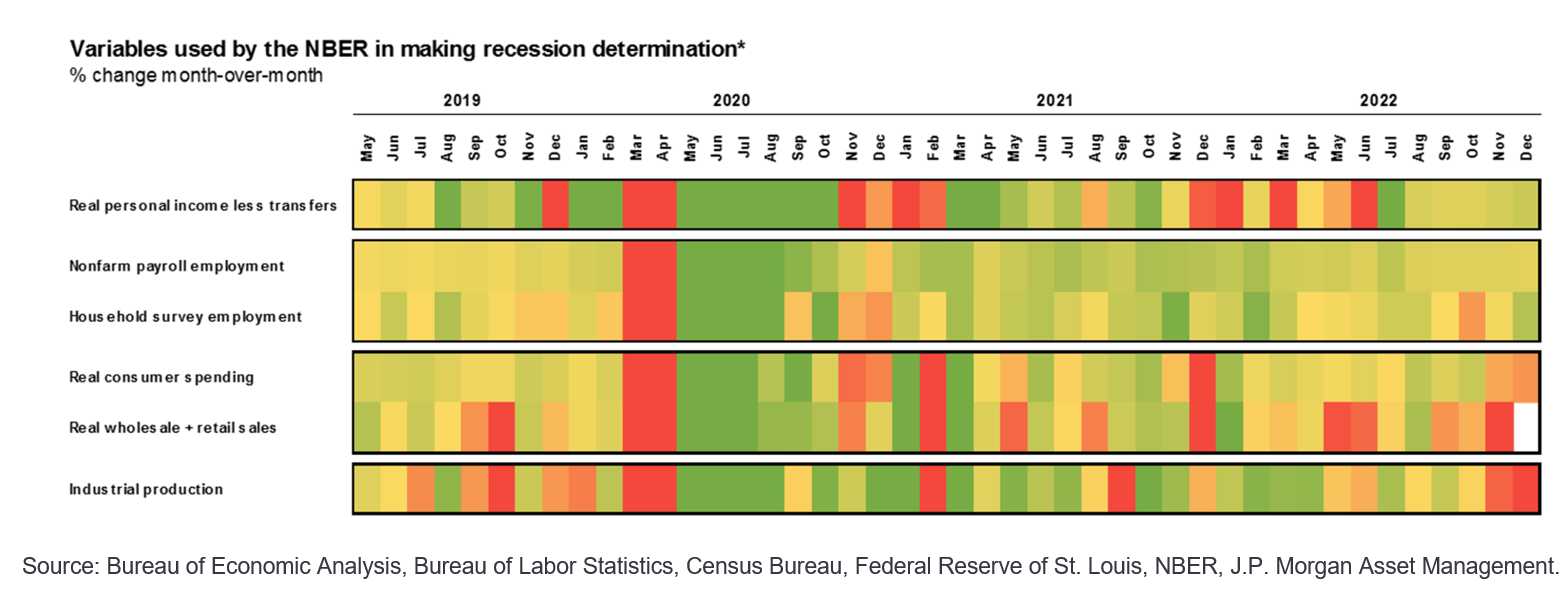 As a reminder, the National Bureau of Economic Research (NBER) is the ultimate arbiter of whether the economy is in a recession. Above are the primary determinants they use – green is a positive trend, red is a negative one, with the shades reflecting something in between. But, as the chart illustrates, it's currently a mixed bag. Employment and personal income remain solid, but there is a noticeable weakness in industrial production and a slowing pace of consumer spending.