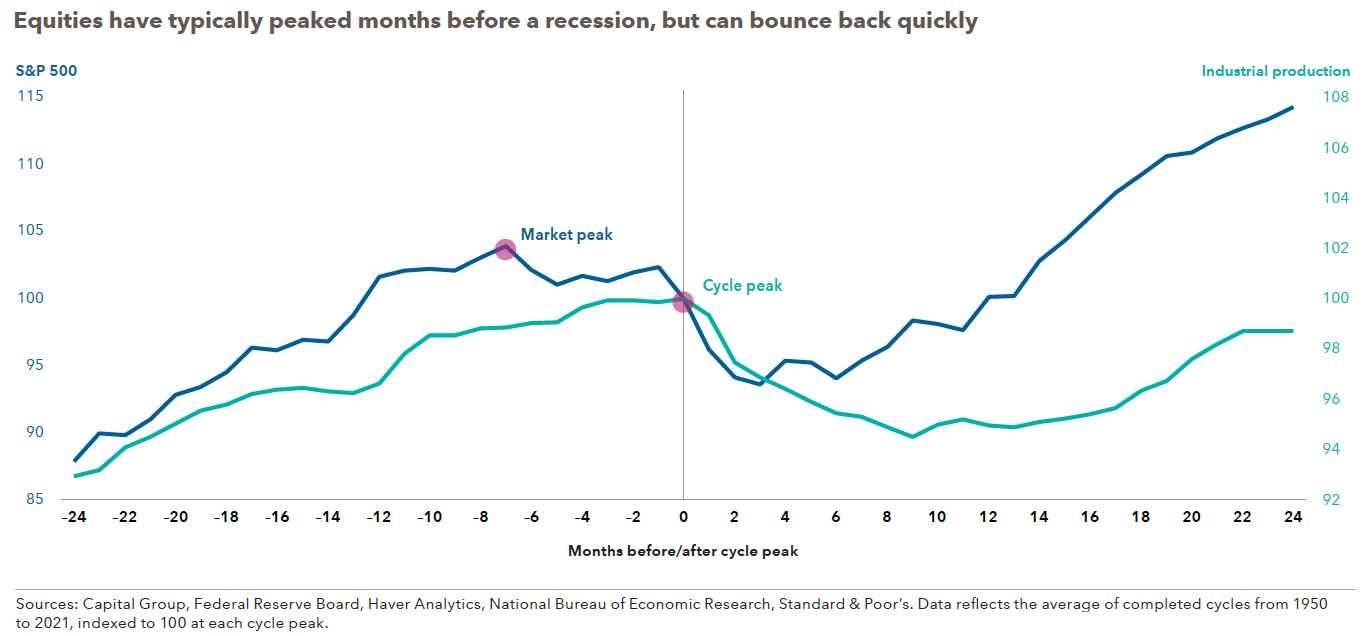 So, what exactly will a recession mean for stocks? The answer is complicated. Below is a great chart from the Capital Group that illustrates the relationship between stocks and industrial production (think economic growth).