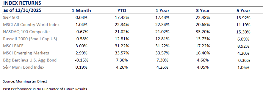 2025 was a Journey year. Not the literal kind, but very much the “Don’t Stop Believin’” variety. We sampled every flavor of risk the market buffet had to offer. DeepSeek and AI risk? Check. War? Still there. Tariffs? Check. Government shutdown? Record-setting check. Market correction? Oh yes. And somehow, as if Journey was playing on repeat, markets still delivered a double-digit return for the third year in a row.