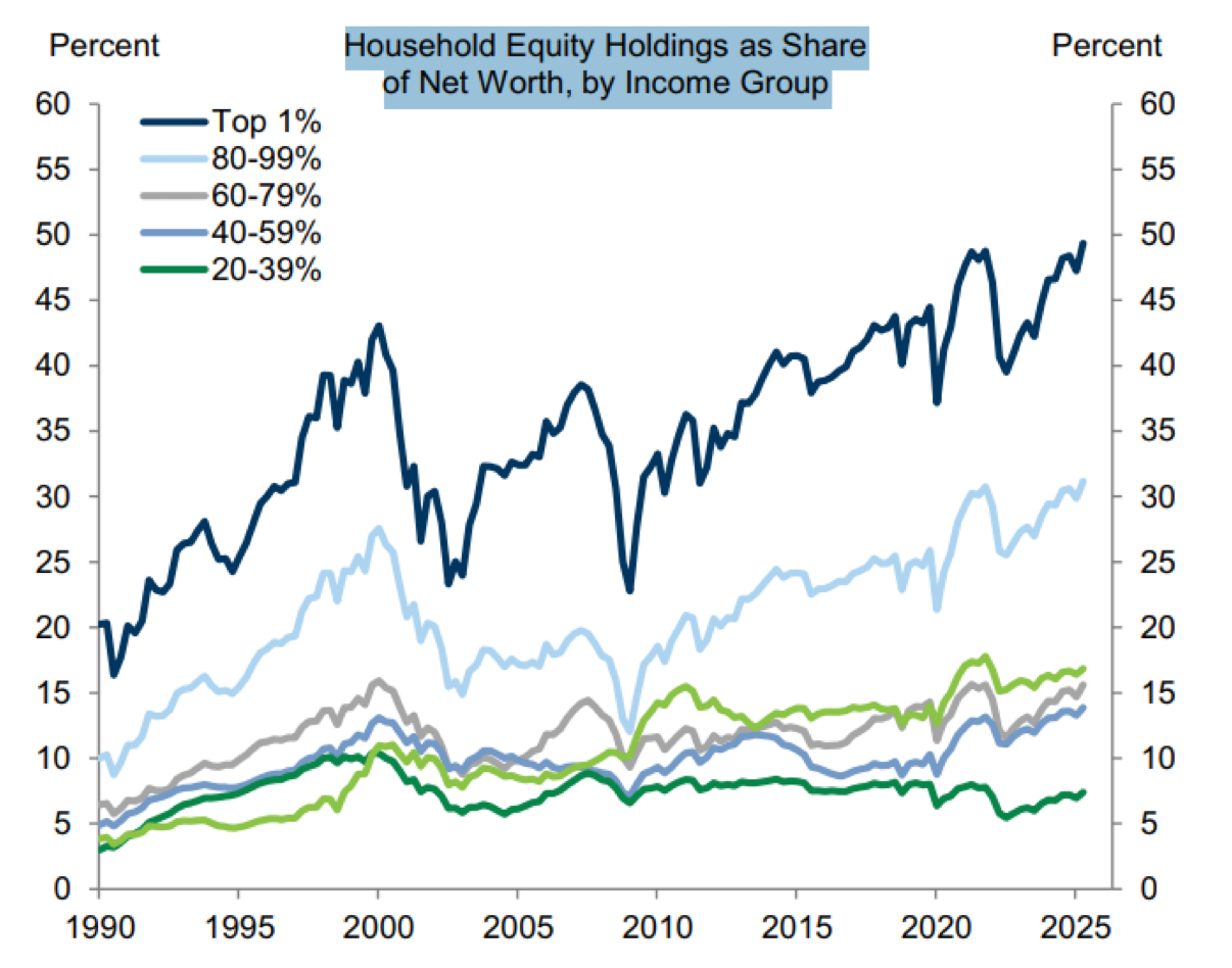 Household fundamentals remain in good shape as well. Balance sheets are healthy, net worth relative to disposable income is sitting near all-time highs, and unemployment—although no longer improving—is still low by historical standards. In plain English: the wealth gap is hard to ignore (not OK), but more are at least participating.