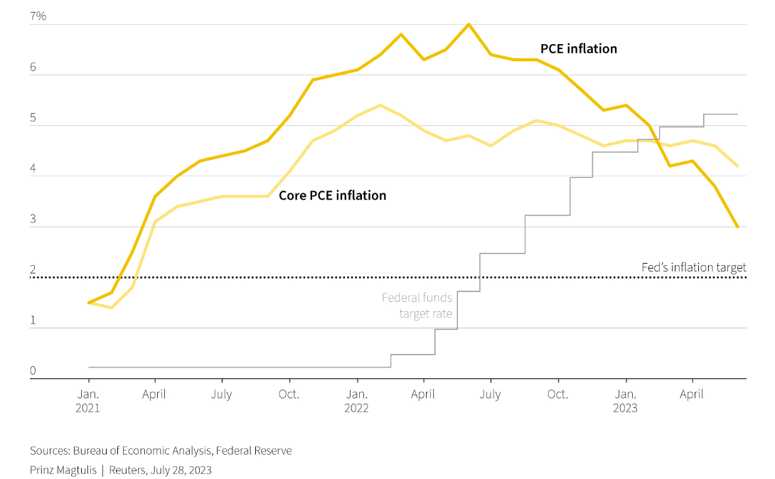 Personal Consumption Expenditures (PCE) came out last week at 4.1% over the prior year, the lowest reading since September 2021. This data followed CPI numbers released earlier in July, showing core inflation at 4.8% - a slight decrease from the previous month.