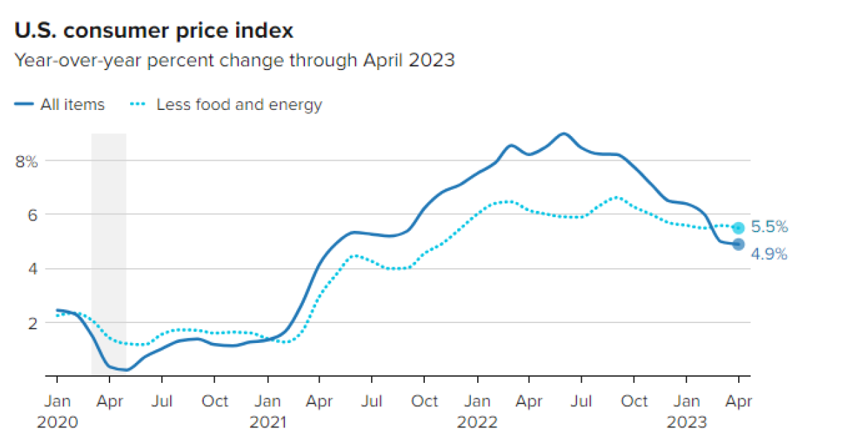 The latest tick from the Consumer Price Index (CPI) came in at 4.9% in April – well below the peak of 9.1% but still frustratingly above the Fed's long-term target of 2%. Also noteworthy, we observed an uptick in consumer prices, with a seasonally adjusted increase of 0.4%.