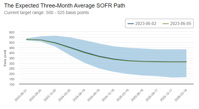 Regardless of the June outcome, the markets believe that rate hikes are coming to a conclusion. The Atlanta Fed's expected rate path, as illustrated below, indicates a clear expectation of declining rates as we move into 2024 and beyond.