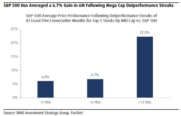 I admit, this one took me by surprise. During the subsequent six-month period after such mega cap streaks, the S&P 500 has risen by an average of 6.7%, with an average climb of 22.2% over the following 12 months. Remarkably, the S&P 500 has achieved positive price returns 100% of the time during these periods. A recent example occurred in April 2020, following a seven-month mega-cap winning streak. Six months later, the S&P 500 had advanced by over 12%, while the 12-month mark saw an impressive 43.6% gain.
