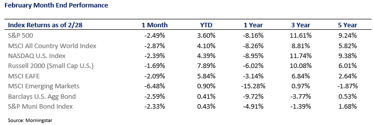 After a euphoric January, stocks and bonds fell in unison as optimism of a new bull market and a softer Fed was dashed. Economic data released last month came in hot – consumer spending jumped 3%. Wall Street was further rattled by inflation reports that remain stubbornly high, and the rate of decline was not as prominent as hoped. In addition, the labor market remains tight, with employment data coming in above expectations – good for the economy but a mixed bag for stocks.
