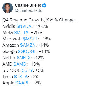The "Magnificent Seven" - a constellation of mega-cap tech titans -- Nvidia, Microsoft, Amazon, Meta Platforms, Apple, Alphabet, and Tesla -- continues to shine as we dive deeper into 2024. The sector's earnings narrative is compelling, highlighted by Nvidia's astonishing 265% revenue growth in Q4 as monumental strides appear to be taking place in Artificial Intelligence (AI). Such growth isn't isolated; the entire "Magnificent Seven" cohort of tech giants continues to deliver eye-popping earnings outcomes.