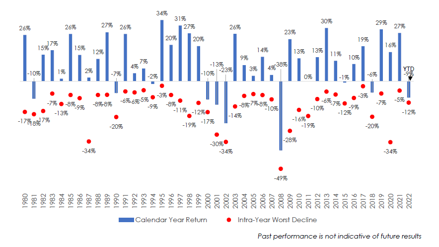 We went back 42 years and simply calculated two numbers: first, the peak-to-trough loss in the Standard & Poor’s 500 during each year, and second, the full-calendar-year return for each year.
