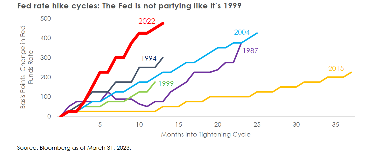 So, what is the Fed to do? At the March FOMC meeting, despite increased uncertainty around the banks potentially having warranted a pause, the Fed raised interest rates by 25 basis points, signaling confidence in its ability to manage financial stability risks. Making clear that elevated inflation is still a top concern, the path ahead is still higher, but the summit is in sight. The median 2023 dot in the Fed "dot plot" lies between 5.00% and 5.25%, which is only 25 bps higher than the current target range for the federal funds rate. The Fed projects it will hold rates above 5% in 2023; however, Treasury markets are pricing in interest rate cuts in the second half of 2023, implying expectations for economic weakness or potential further stress.