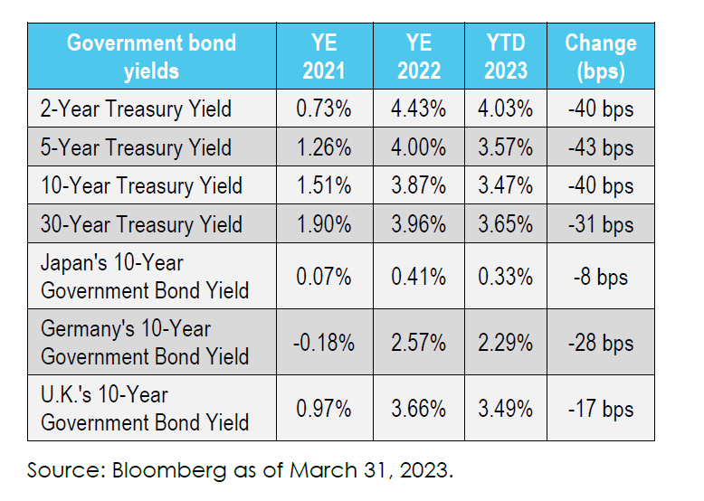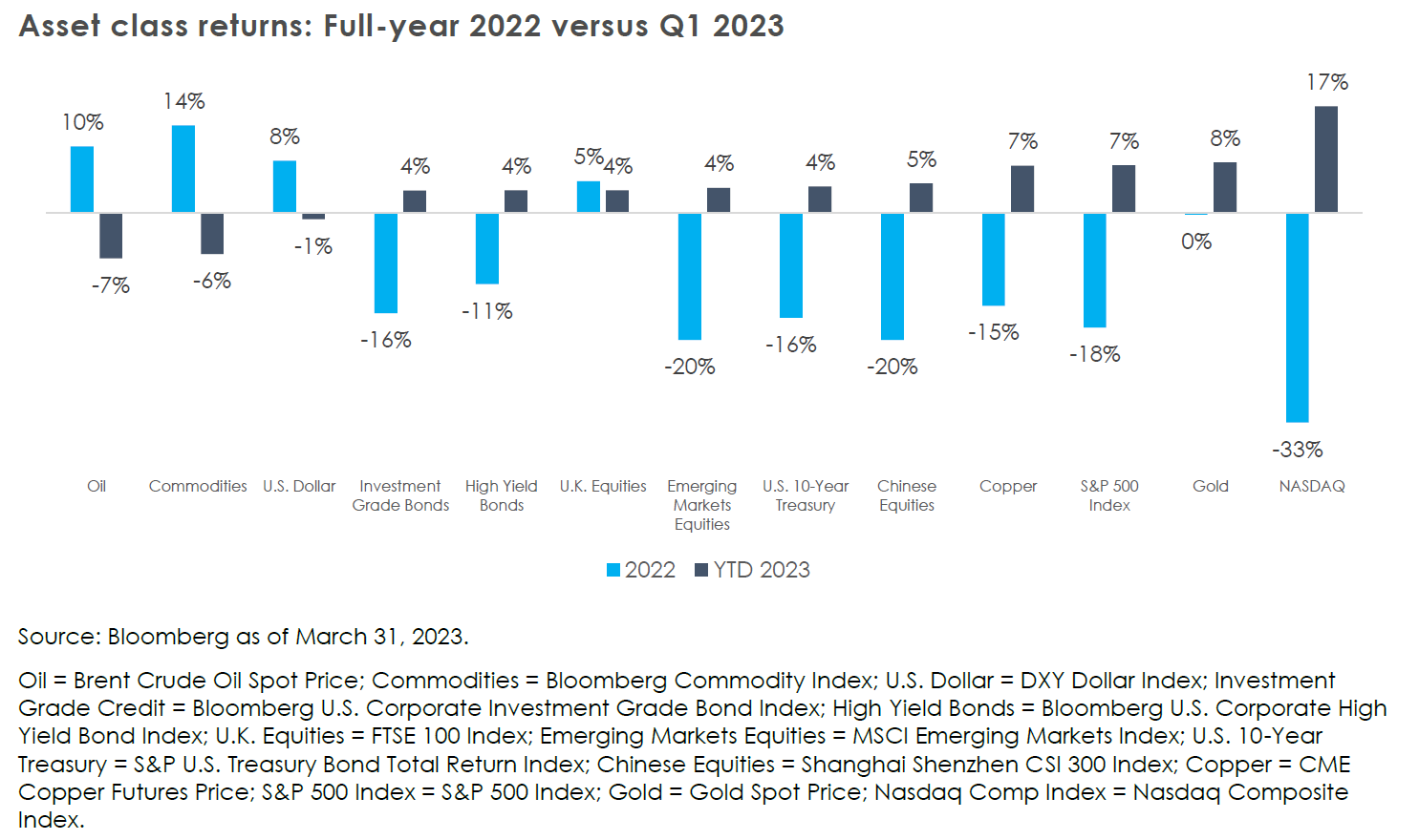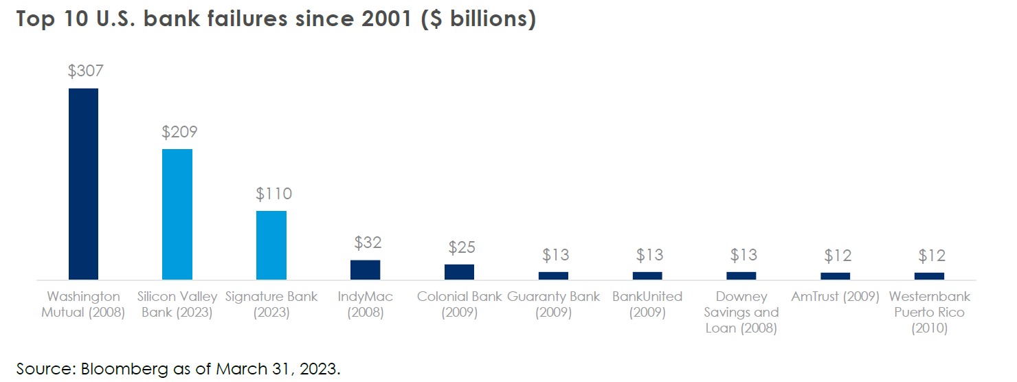 For financial markets, the first quarter of 2023 was marked by a rollercoaster of volatility, emotions, and sudden shifts in narrative. January saw a strong start to the year with a rally in equity and credit markets as interest rates stabilized and investors took comfort in a big drop-off in the Consumer Price Index. Then, February arrived and with it, data showing a bulletproof labor market and stickier-than-anticipated inflation, leading to a resurgence in Treasury yields and a consolidation in equity markets. Right after short-dated Treasury yields hit their highest levels since before the Great Financial Crisis and strategists began calling for a 6% terminal Fed funds rate in early March, the U.S. experienced the second and third-largest bank failures in history behind Washington Mutual in 2008. Fears of a systemic crisis quickly spread as Treasury yields plummeted. The crisis was not contained to the U.S. as Swiss bank Credit Suisse came under enormous pressure and was hastily acquired by UBS.