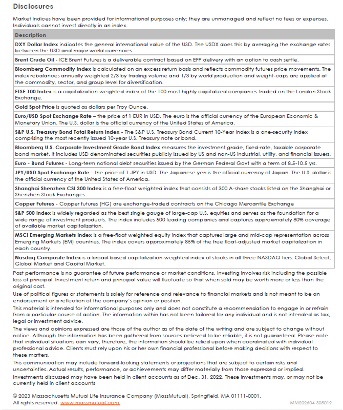 As we reflect on the first quarter, investors learned some important lessons. The banking failures showed how markets can react with lightning speed. While 2022 was volatile, the first quarter of 2023 brought the most outsized fixed income volatility swings since the depths of the global financial crisis when Lehman Brothers declared bankruptcy in 2008. If we went back to the beginning of the first quarter and told you that the U.S. would experience two of the largest banking failures in history since 2008, but that equity markets would return 7.5% over the quarter, you may not have believed us. This demonstrates the importance of a long-term mindset and that focusing on specific events or short-term outcomes might not be as valuable as one might think to investment performance.