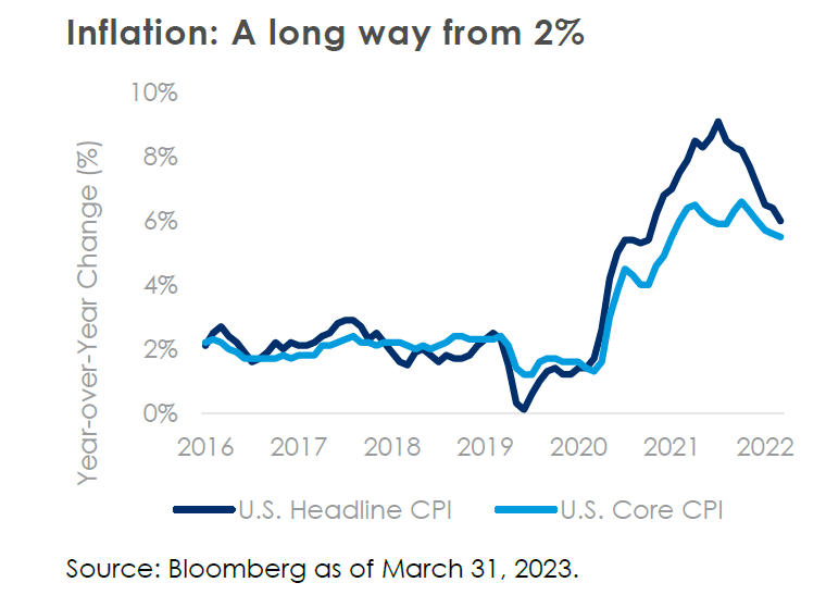 Estimated 2023 U.S. GDP growth has been revised up from a very weak 0.3% at the beginning of the year to approximately 1%, compared to growth of 2.1% in 2022. The healthy labor market has supported stable consumer spending though inflation pressures continue to weigh most heavily on lower and middle-income households. The housing market and manufacturing sectors continue to cool, and as we have written before, the impacts of monetary policy act with a long and variable lag. Recession remains widely expected but the timing and depth remain a question mark. The “soft landing” versus “hard landing” debate continues with the hard landing getting more attention in light of the banking crisis.