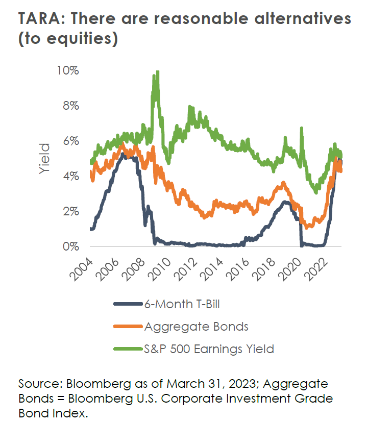 We remain focused on interest rates, valuations, and earnings. Amid all the noise, corporate earnings and interest rates matter most in the long run. Equity valuations remain above historical averages with focus on downside risks to earnings and profit margins. Similarly, credit spreads are near their long-term historical averages and do not reflect recession or systemic risk. Lastly, the Fed’s hiking cycle has upended markets and contributed to the failure of banks, but it has also made fixed income and cash alternatives much more attractive asset classes.