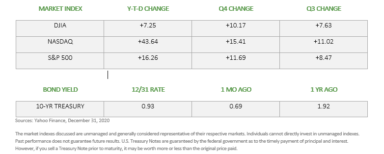 Looking back … looking forward. Optimism grew on Wall Street as the quarter progressed. The Nasdaq Composite, S&P 500, and Dow Jones Industrial Average all saw double-digit Q4 gains, and all three benchmarks advanced for 2020.11