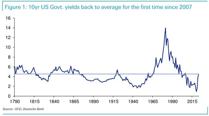 In a noteworthy financial development, the 10-year Treasury yields have ascended to heights unseen since 2007, eclipsing the 4.6% threshold. Below is very interesting chart from Deutsche Bank illustrating historical yields on the 10-year Treasury Bond. You can see how quickly yields have jumped over the past year, which has continued so far into 2023.