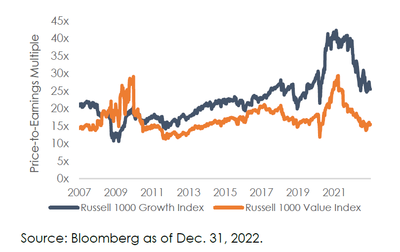 The same has been true of sectors, with technology being the worst performer (and most expensive to start the year) and energy being the best performer (and cheapest to start the year). The growth-heavy NASDAQ declined over 30%; in contrast, the Russell 1000 Value Index was down around 10% on the year. Despite the relative performance, growth stock valuations remain elevated relative to history (21.5x forward price-to-earnings ratio) while value stocks (14.9x) sit at more reasonable valuations.
